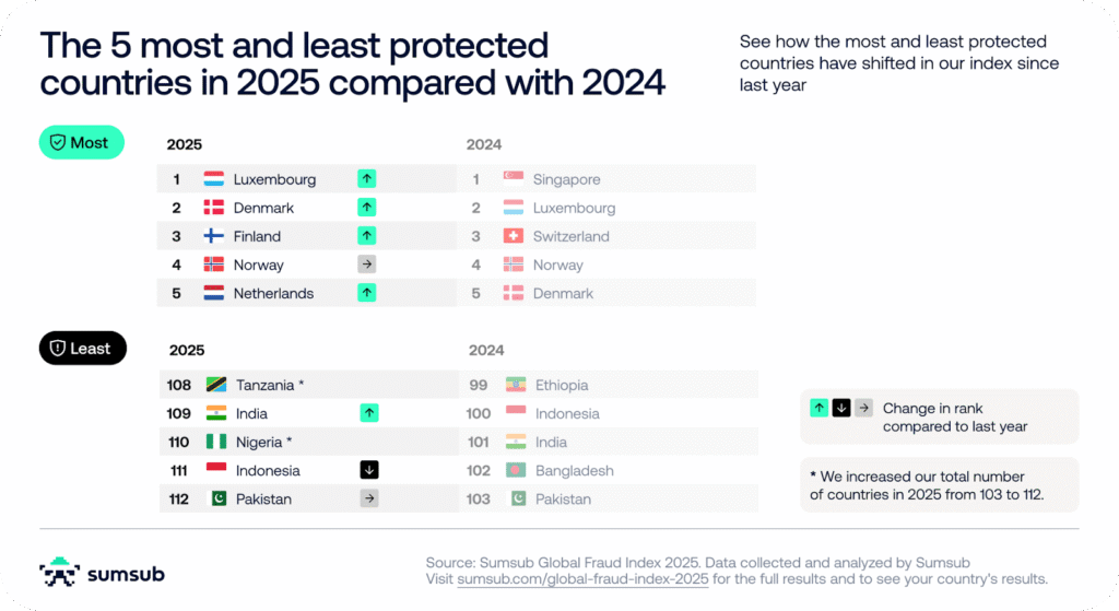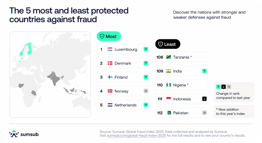 Fraud is universal, but fraud resilience isn’t. To capture the scale and complexity of fraud, Sumsub has published the 2025 Global Fraud Index—the second edition of the report, following its first release in 2024—a comprehensive study assessing fraud susceptibility across 112 countries. Rather than counting incidents of fraud—which you can find in The Sumsuber News section—the Index layers in structural indicators to reveal why fraud flourishes in some countries but not others.