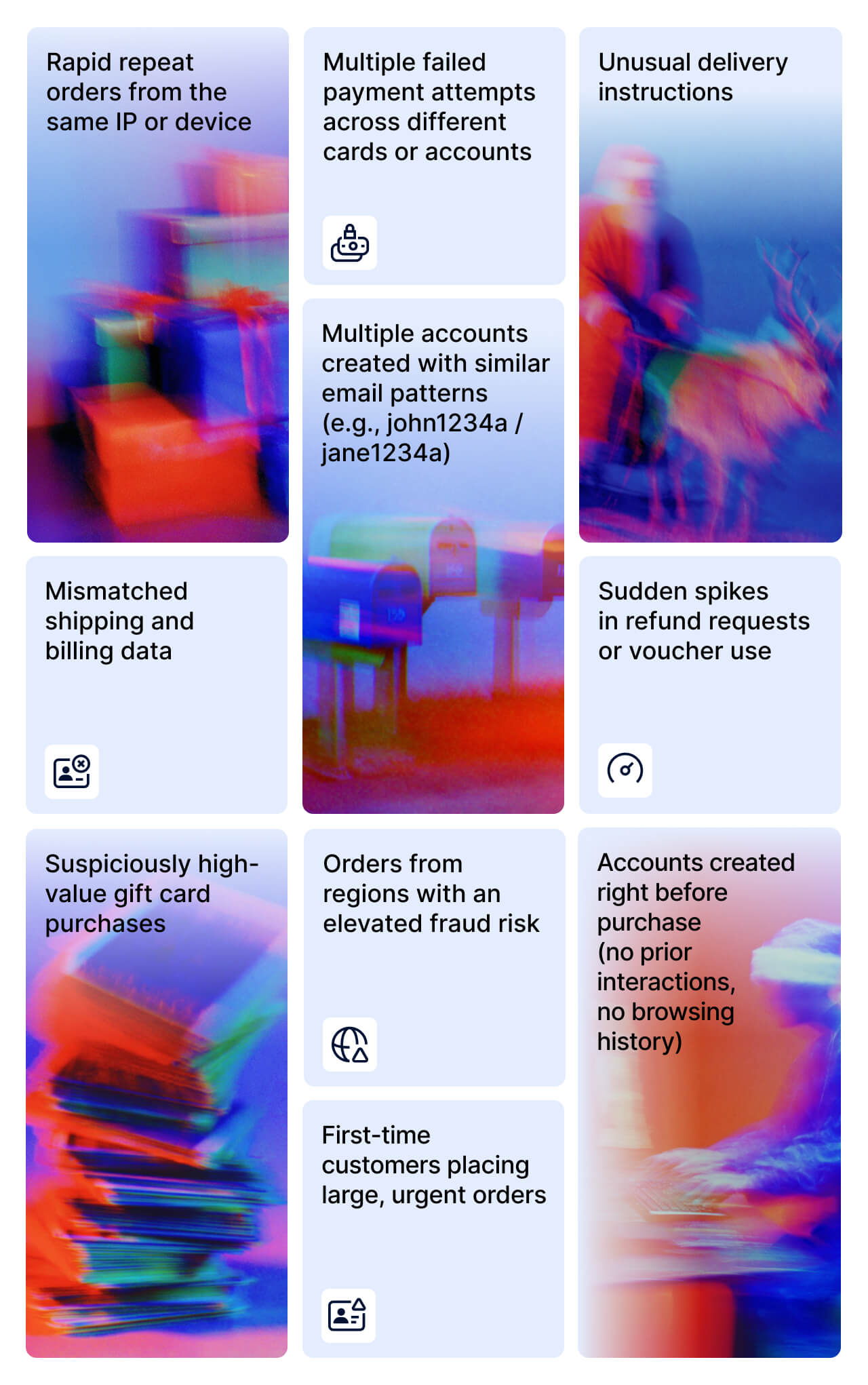 - Multiple failed payment attempts across different cards or accounts
