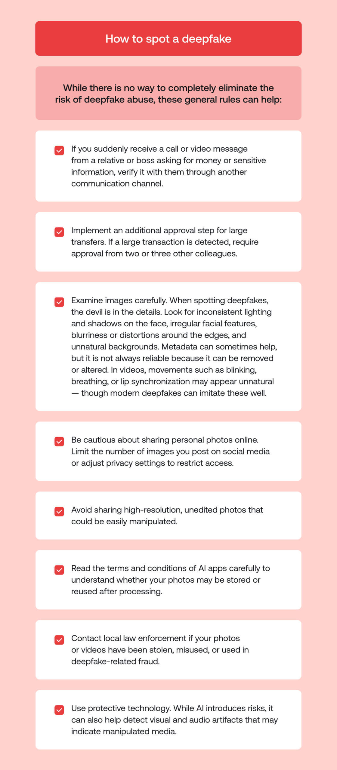 While there is no way to completely eliminate the risk of deepfake abuse, these general rules can help:
