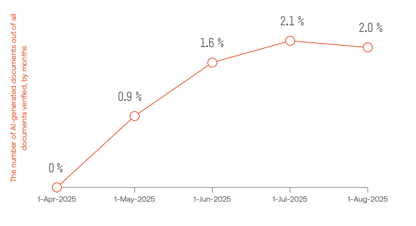 According to our data, 2% of all fake documents detected in 2025 were generated using tools such as ChatGPT, Grok, and Gemini. While this may seem like a small share, it represents just six months since we first spotted these types of documents in April 2025. Given the ongoing AI race among major tech companies, this trend could accelerate rapidly, potentially increasing the scale of the problem in the near future.