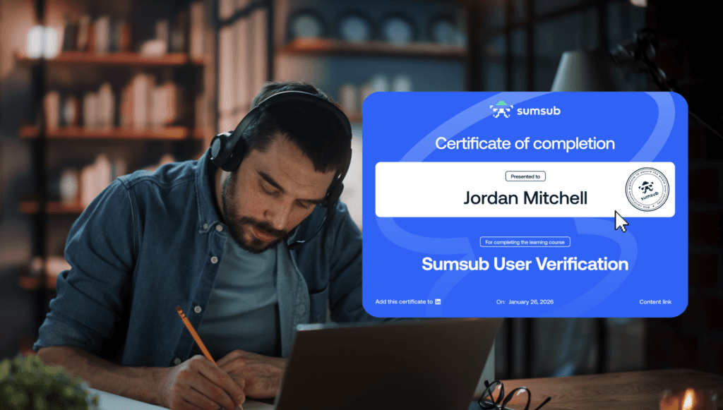 Sumsub User Verification Product Certification is a free, hands on course that teaches you how to configure, run, and optimize Sumsub User Verification inside the Dashboard. You follow real walkthroughs and screencasts, from flows and decision logic to applicant review and analytics.