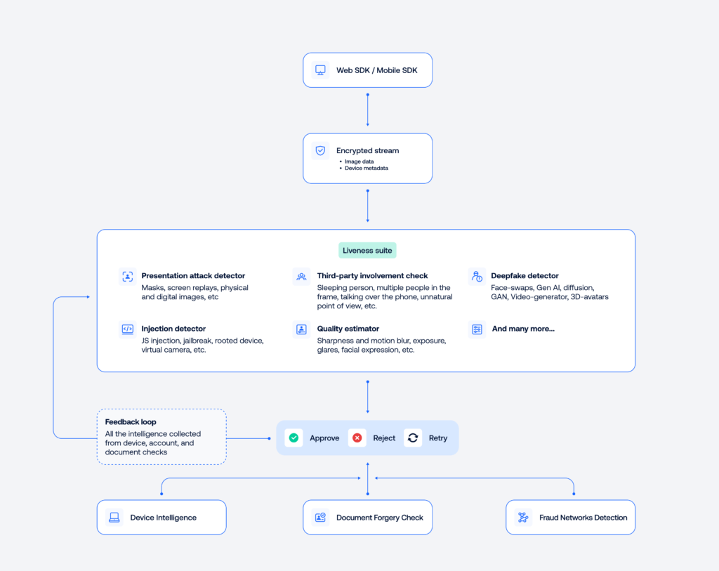 - Signals are collected from multiple sources, not on a single anomaly vector. The multilayered fraud detection system analyzes documents, geolocation, IP address, device signals, facial biometrics (liveness) data, and cross-checks verification information from multiple users to spot fraudulent network activity;
