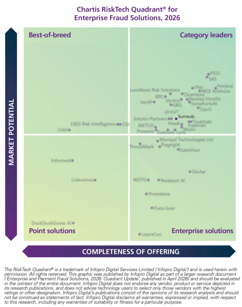 Sumsub has been recognized as a Category Leader in the Chartis RiskTech Quadrant® for Enterprise Fraud Solutions* 2026. The report evaluates vendors based on the completeness of their offering and its market potential, positioning Sumsub among the top providers addressing increasingly sophisticated fraud threats faced by enterprises worldwide.
